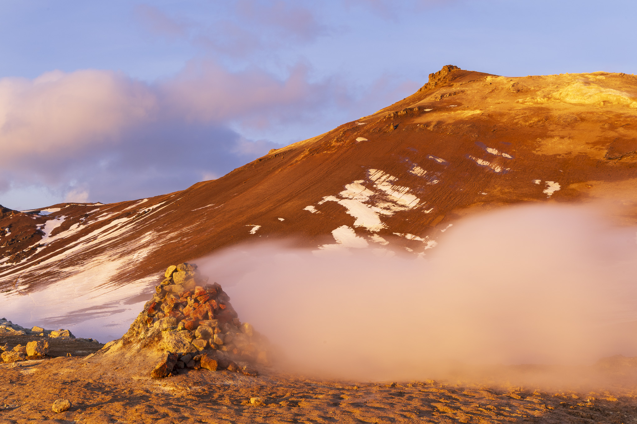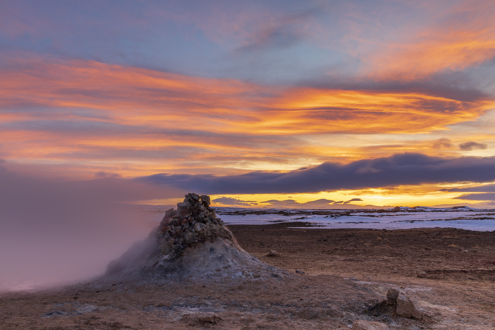 Au lever du soleil, entre ses fumerolles sulfurées jaunies et ses marmites de boue bleue bouillonnantes, Hverir, une petite montagne jaune, orange et rouge qui semble raconter la naissance du monde.