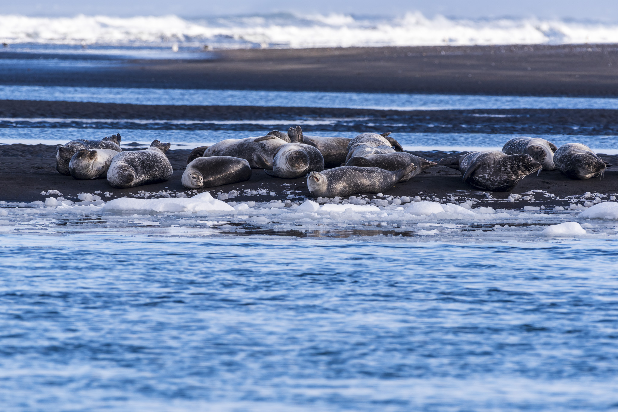 Exploration partielle de la péninsule de Vatsnes et du Hunafjördur. La formation rocheuse de Hvitserkur est unique. Elle ressemble à un animal préhistorique qui serait venu se désaltérer dans le fjord partiellement pris par la glace. Un très beau sujet de pause longue. Une colonie de phoques a élu domicile sur la rive opposée, ils viennent parfois observer les photographes en action !