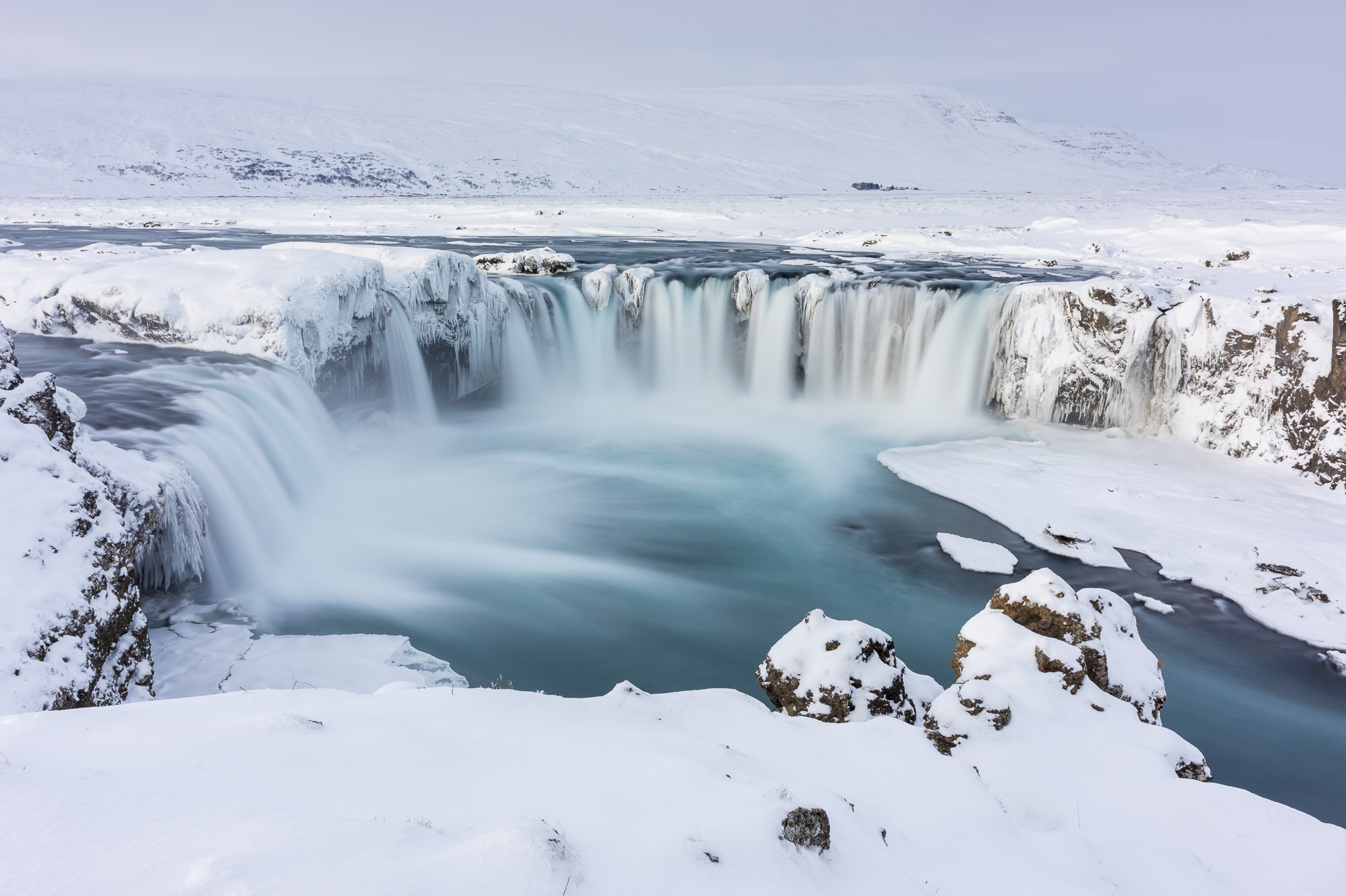 Si la route est ouverte, nous partons photographier la chute la plus puissante d’Europe. 100m de large, 44m de haut. Un gigantesque mur d’eau, dans un paysage de glace et de neige.