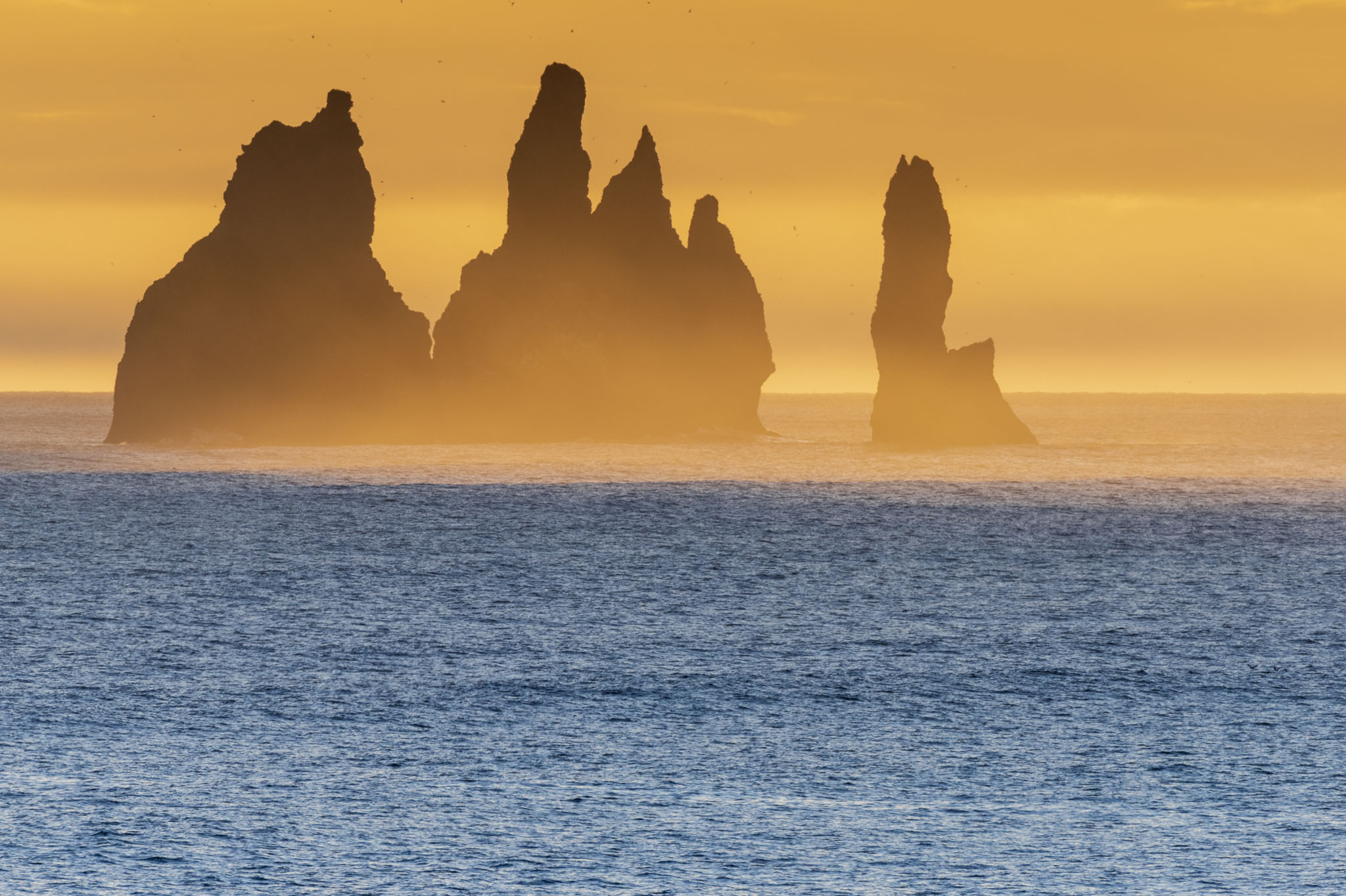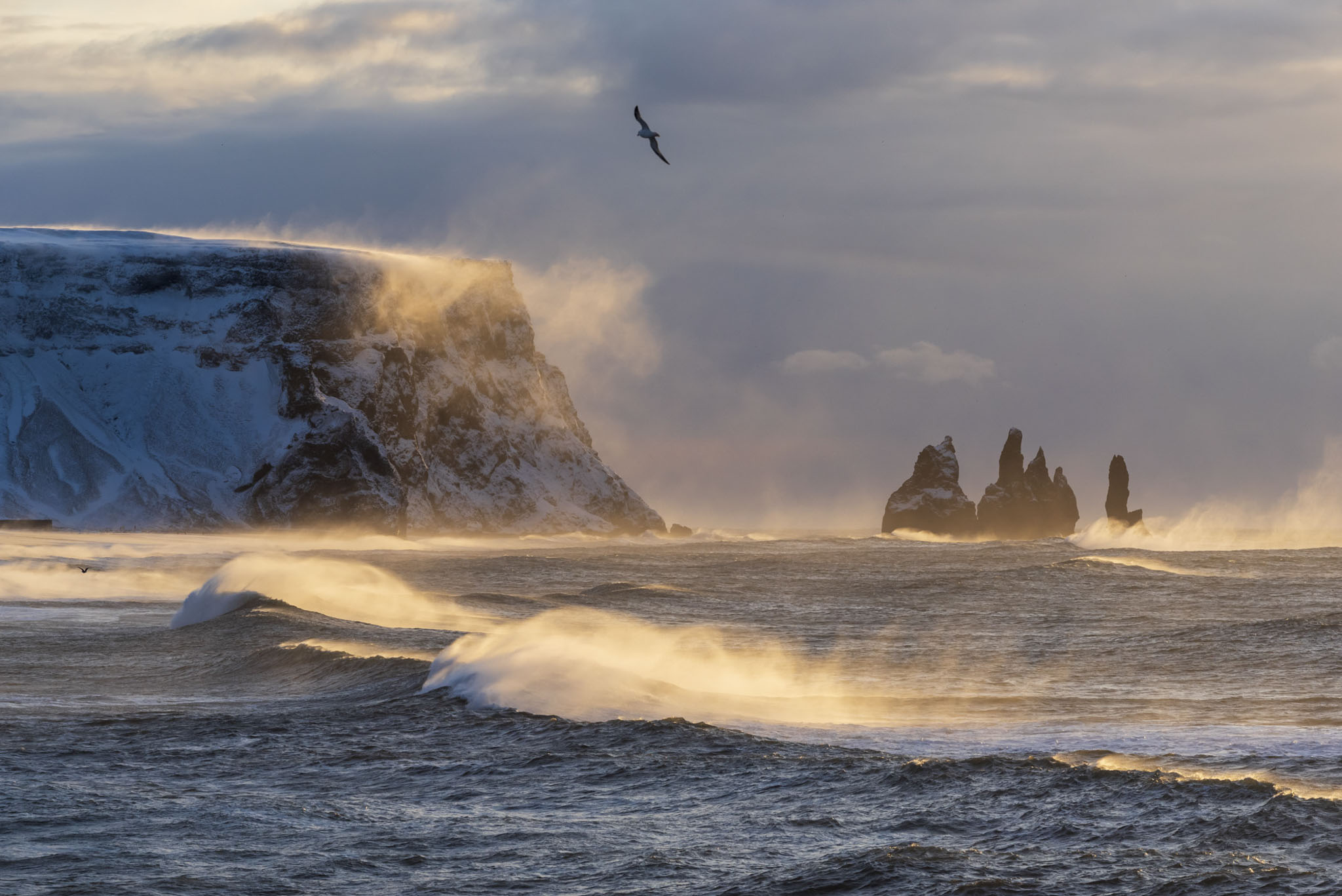 C’est un promontoire basaltique impressionnant percé d’arches colossales. En contrebas les plages de sable noir de la côte sud s’étendent à perte de vue vers l’ouest et s’achèvent à l’est par les aiguilles de Vik. Au lever du soleil, l’océan atlantique nord, souvent déchainé à cette saison, offre un spectacle dantesque. Ses lames puissantes se brisent sur les rochers noirs, les fulmars boréals affrontant la tempête, pour des prises de vue inoubliables.